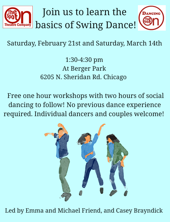 Led by Emma and Michael Friend and Casey Brayndick. Emma and Mike have been Swing Dancing for over 15 years, and taught Swing classes through the Swing Dance Club at Lawrence University. Casey and Emma have danced other styles since they were 3 years old, Casey learned Swing from Emma, and they have taught workshops together at Knox College and in Buxton, England! They’ve both created and performed in many Dancing On The Spot shows as well. All together the trio have danced in places all over the Chicago-land area, especially at Big City Swing, Fizz, and Traffic Jam, but also in bookstores, grocery stores, restaurants, anywhere music might be playing!