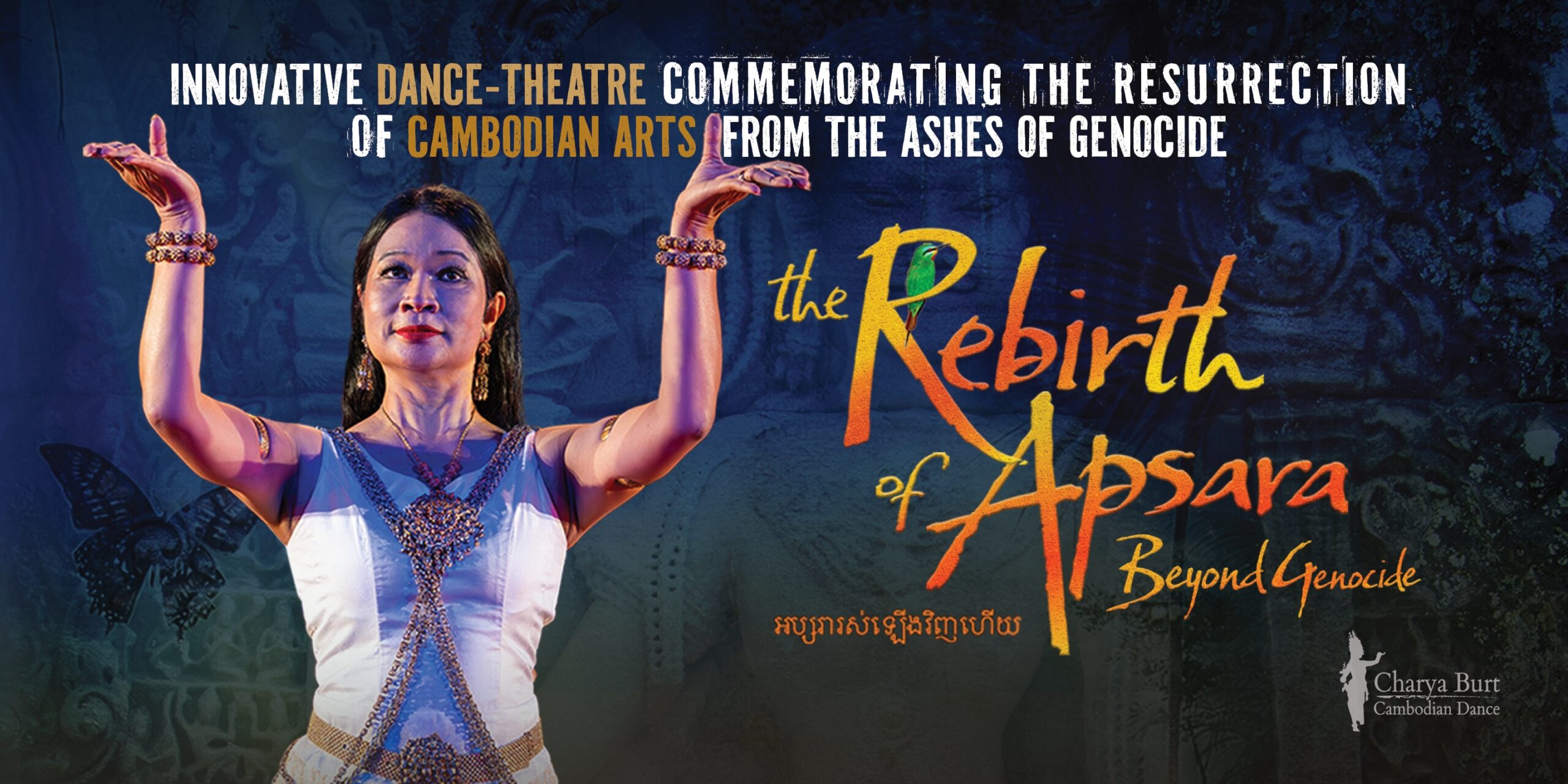The Rebirth of Apsara: Beyond Genocide premiered on April 19, 2025 at the Oakland Asian Cultural Center and was mounted again June 6 and 7 at the Middlesex Community College Academic Arts Center. This full-length multi-media dance/theatre production is created to observe the 50th Anniversary of the beginning of the Khmer Rouge Genocide and to honor its survivors, the resilience of the Cambodian spirit, and to celebrate how Khmer arts has been and continues to be transmitted from generation to generation. It is an adaptation of The Rebirth of Apsara, a Hewlett 50 Arts Commission that premiered at Sonoma State University’s Green Music Center in Rohnert Park, CA on February 1, 2024. Through a story created by Rob and Charya Burt, the production investigates the relationship between art and war exploring how Cambodian arts and in particular Apsaras, fabled female celestial beings, have embodied the essence of Cambodian culture from ancient mythology to its post genocide resurrection. Mirroring her own life’s journey as an artist to explore the impact Apsara has had on both Khmer civilization and Cambodian artists of today, Charya Burt sets her re-imagined classical dance gestures to music by renowned Cambodian-American composer Chinary Ung and traditional Khmer pin-peat all tied together by a soundscape performed live by Marimba Lumina virtuoso Joel Davel and an engaging video backdrop designed by Hsuan-Kuang Hsieh. The text is written by Cambodian-American theatre artist Kalean Ung with additional text by Charya Burt developed to make this adaptation of the original more personal. Joining lead performer Charya Burt is dancer/soloist Chakravartin Sokhomsan, dancer Hannah Chea, and community dancers from the Cambodian Classical Dance Tep Nimmit Dance Troupe.