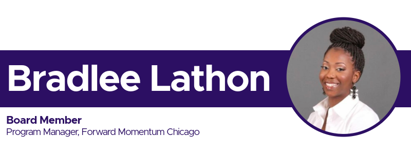 Bradlee Lathon (she/her) is an educator, performer, and lifelong learner. Nina Simone says, “An artist’s duty, as far as I’m concerned, is to reflect the times.” This is the philosophy Bradlee finds her work rooted in. She believes in considering the influence and impact of poverty, community violence, and socioeconomic status on student learning, engagement, and behavior. Bradlee has been a part of the Programming team at Forward Momentum Chicago for nearly a decade, her most recent role as Director of Education and Community Partnerships, and is a member of its founding leadership team. Over the last few years, Bradlee has become a Certified Healing Centered Engagement practitioner, a member of Ingenuity’s ‘23 Constellations Cohort, and a speaker at the 2023 One State Conference in Springfield. She has combined her continued teaching in the classroom with her experience as an Arts Administrator to change not only the classroom experience for Black and Brown students but also for the Artists who teach them. Bradlee holds a Bachelor of Arts in Computer Studies and a Master’s of Applied Computer Science.