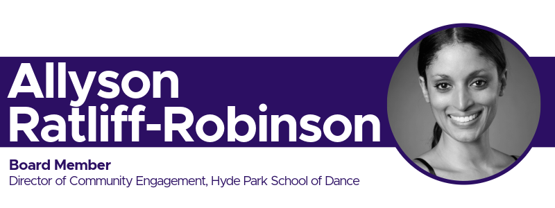Allyson Ratliff-Robinson (she/her) brings over 20 years of experience in arts education and management to her role as Director of Community Engagement and member of the artistic team at the Hyde Park School of Dance. She is dedicated to building connections between artists and audiences, fostering opportunities for both established and emerging talent.