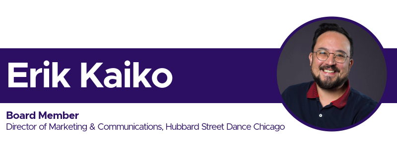 Erik Kaiko (he/him) is a Chicago-based arts marketer and producer. Prior to joining the Hubbard Street team as Director of Marketing & Communications, he served as Director of Marketing & Communications at Writers Theatre. He is also a co-founder of Token Theatre, Chicago’s newest Asian American theatre company, and a board member with Filament Theatre, serving the young people of Chicago. Erik is the lead producer of the new musical, THE BRASS TEAPOT, currently in development. NYC: New York Theatre Workshop, Snug Harbor Productions, Invisible Wall Productions. B.S. Northwestern University, MFA Columbia University.