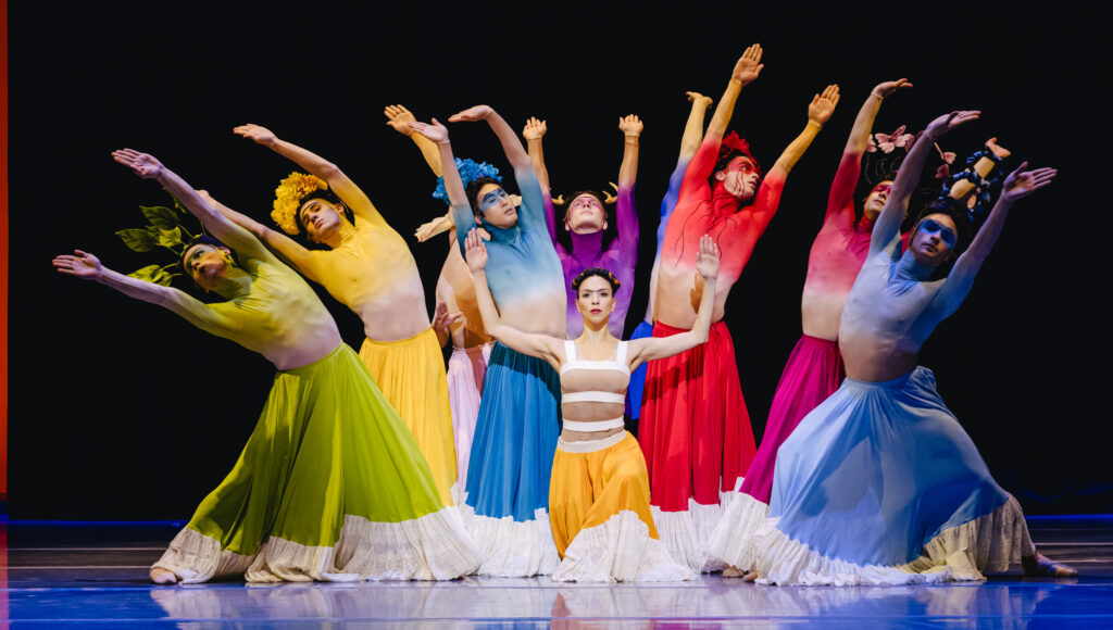 In “Broken Wings,” they bring dramatic intensity to the mechanical movement of a chorus of skeletons in white death masks, their jutting arms and robot-like staggering steps a sharp contrast to the folkloric authenticity of the male corps’ Mexican Deer dance and to the dramatic realism of Kahlo’s physical and mental pain.