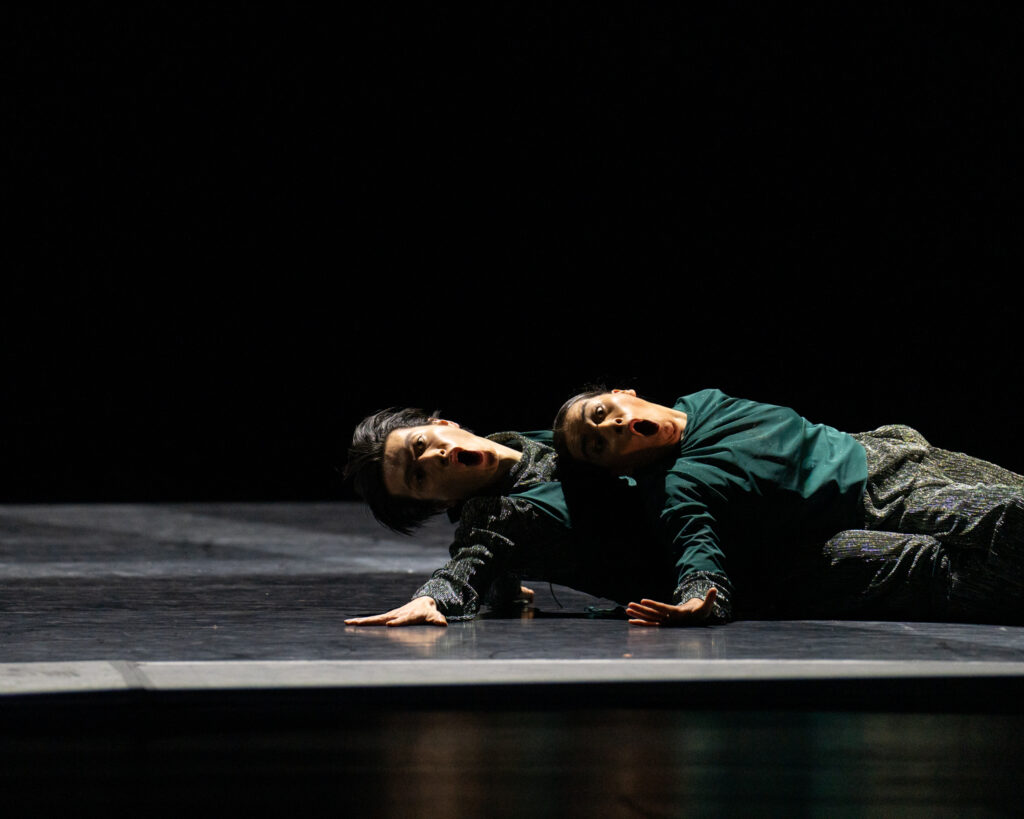 The gem of the evening comes from Aszure Barton’s “A Duo.” Here, Shota Miyoshi and Cyrie Topete (the opening night cast) immediately transport us to a different world, appearing like a weird pair of impish scarecrows eerily advancing upstage. Exquisite costume design of baggy, shimmery silver pants and green velvet from Rémi van Bochove adds to the whimsy. Quirky humor and athleticism reveal layer after layer of a unique, silly, inventive dance language.