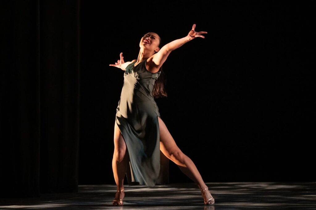 “333” (2025) is a solo elegy choreographed by Nan Giordano and Cesar G. Salinas and danced by Erina Ueda. This piece came as close to being a visual sonnet as any dance could without actually using written or spoken language. Set to music by Otis Redding, the movement transitioned with the quickness of brain synapses firing nerve impulses to the body, and spanned the gamut of emotion, from the contrasting extremes of resignation, denial, determination, stoicism, defeat, sheer will, and ultimately courage. The dance didn’t so much end, but rather, like the music itself and Ballard’s lighting, it faded off to silence and blackout, a statement in itself.