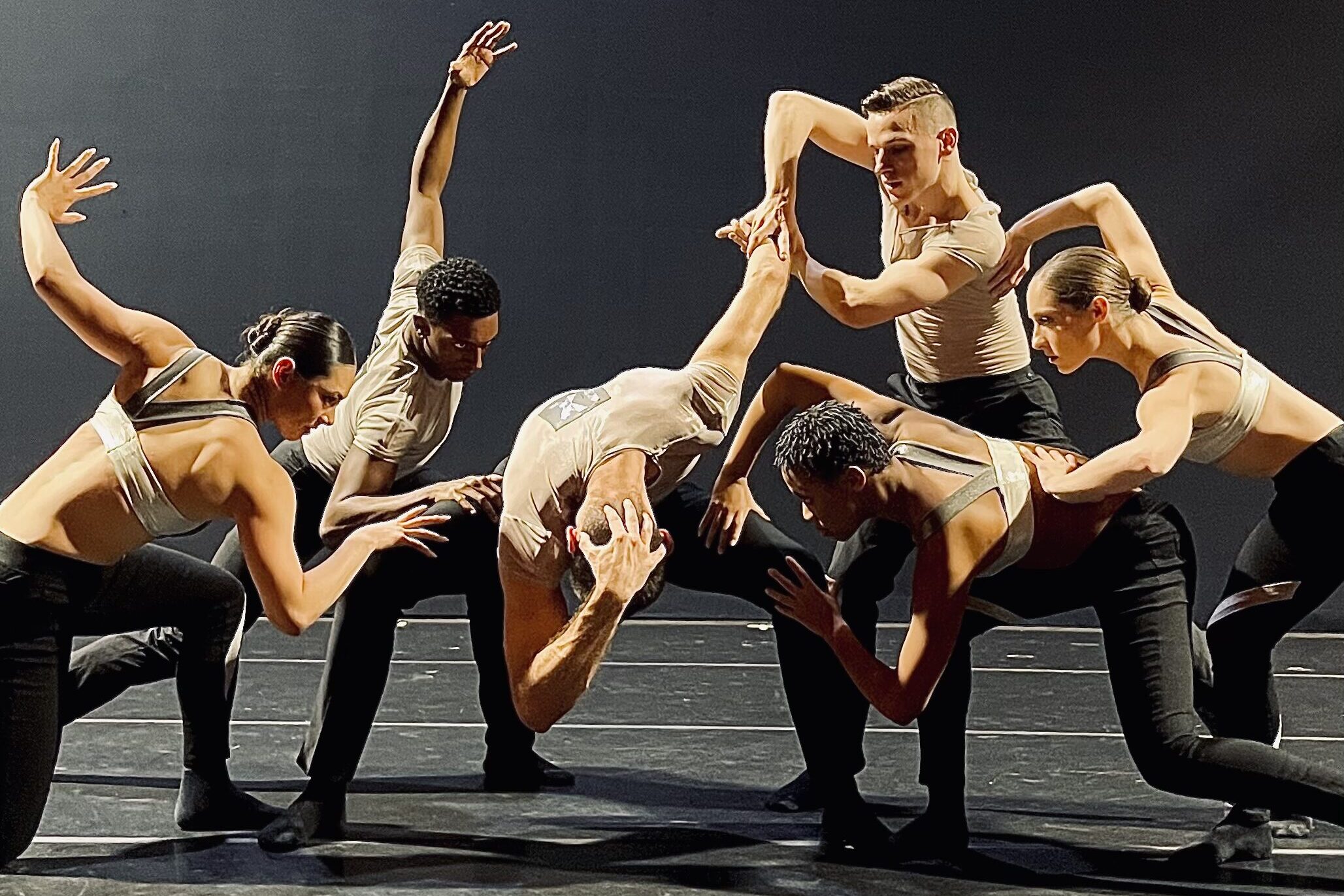 “Interlinked” (2025), choreographed by GDC dancer Simon Schuh, is a percussive study in body isolations and human sculptural design. Acrobatics, shifting visual focus, and change of spatial levels create a sense of excitement and even a tinge of anxiety in Schuh’s abstraction of the human body.