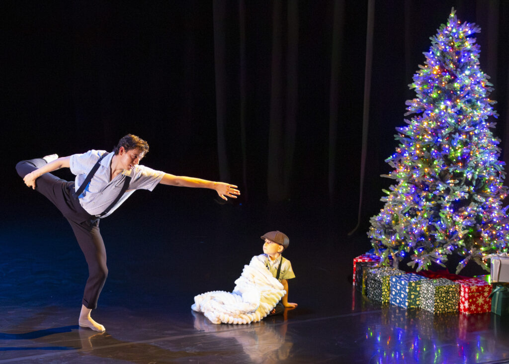 Set in a nonspecific era with muted-color costumes hinting at vintage 1940s with suspenders and A-line dresses, a wonder-filled child (beautifully danced by the promising Peter Westergaard) sets the dance in motion. Smith then introduces us to his young parents at Christmas time, clearly in a struggling relationship. Narrative unveils through a series of vignettes in two acts set to familiar Christmas music (both religious and non-religious) that follow the child, then the troubled adult he becomes, suffering the consequences of his parents’ bickering.