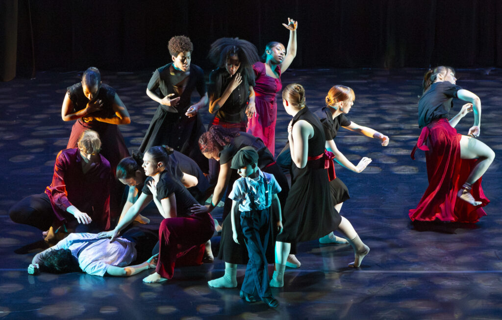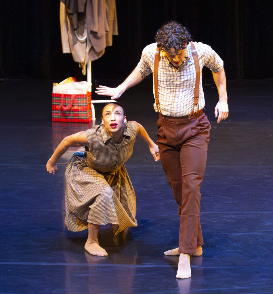 As the parents, Jack Halbert and Mya Bryant possess a loving, chemistry-versus-tension relationship. Through waving arms, undulating torsos and sweeping lifts, they push and pull with bliss yet with deep sadness, wishing things were otherwise. Bryant dances with such longing and ease but tightens in reaction to her partner’s gentle caresses and rough arm grasps. The pair’s movement is thick, as if the air between them has become heavy.